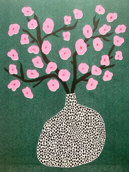 Risograph print, edition of 50. Cherry blossom branch in a detailed vase.