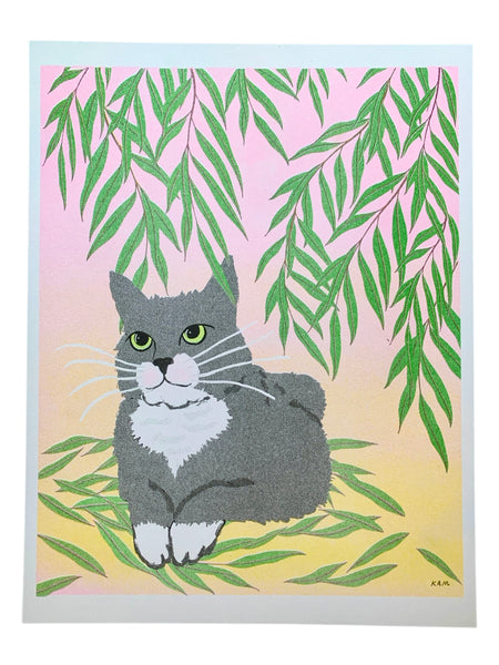 Risograph print of a a gray and white Cat sitting under a willow tree