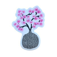 3" vinyl sticker of three cherry blossoms in a patterned vase