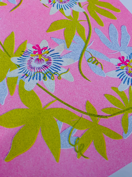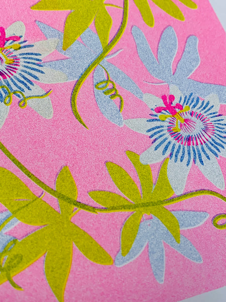 Risograph print of an illustration of passionflowers in pink, blue, and green.