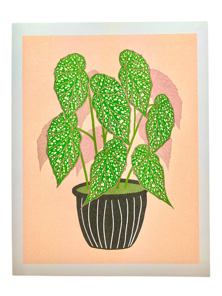 Risograph print of a drawing of a begonia plant in a black and white pot.