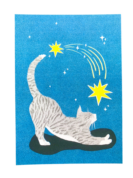 Risograph print of a striped gray cat having a big stretch with a starry blue background. Printed to edge.