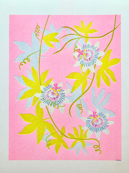 Risograph print of an illustration of passionflowers in pink, blue, and green.