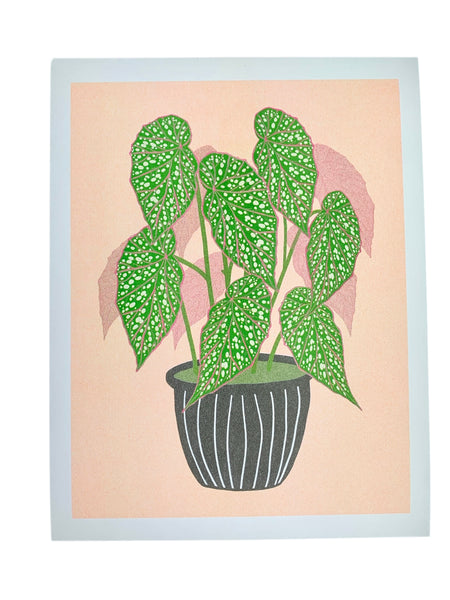 Risograph print of a drawing of a begonia plant in a black and white pot.