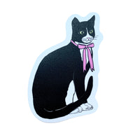 3" vinyl sticker of a tuxedo cat with a pink ribbon around their neck, die cut